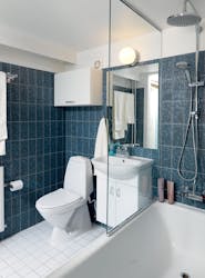 Vi har behållit badkaret. Det är skönt att låta kroppen sjunka ner i ett varmt bad - ren wellness, som det heter i dag. Till vardags nöjer vi oss med en dusch, som går snabbare och inte kräver så mycket vatten. Problemet är duschdraperiet, som inte riktigt håller tätt, vattnet rinner ut på golvet. Lösningen är en glasvägg mellan badkaret och taket. Vi avslutar med att montera en läcker duscharmatur.
