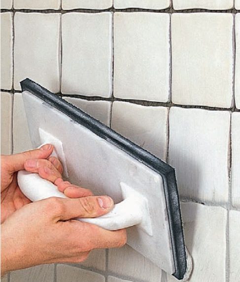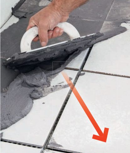 Stryk på fogmassan med en fogbräda. Se till att pressa ner massan ordentligt i alla fogar - vänd och vrid fogbrädan som det passar. Dra av överflödig fogmassa från plattorna med diagonala rörelser, så att så lite som möjligt behöver tvättas bort.