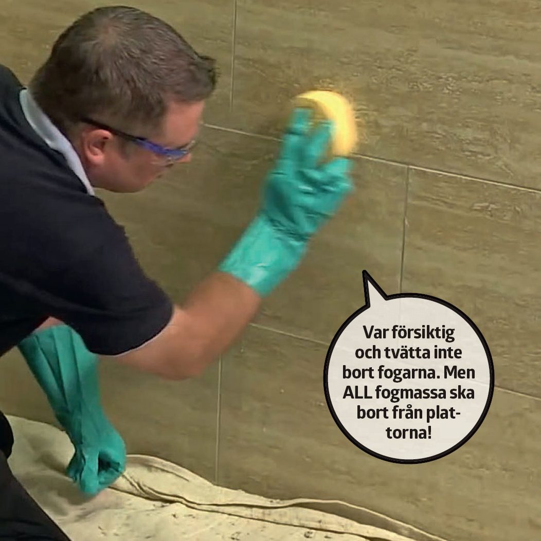 Lägg fogmassa på fog-brädan eller gummispackeln, och dra ut den över plattorna med diagonala strykningar. Säkerställ att fogmassan hamnar i alla fogar, och fyll i efterhand på de ställen där det saknas. Dra bort överflödig fogmassa med brädan, och låt det sätta sig 5-10 minuter innan rengöring, beroende på rumstemperatur och luftfuktighet.