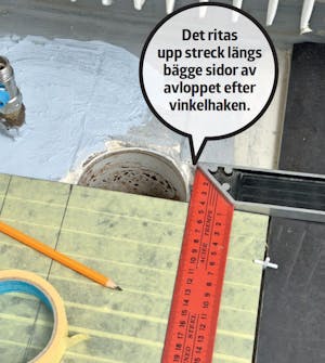Sätt tejp på plattan så att du kan rita på den. Här ska det mätas upp för ett hål mitt i plattan där avloppet ska vara. Rita först ut bredden på hålet och räkna ut exakt var på plattan det ska placeras. Rita ut hålet.