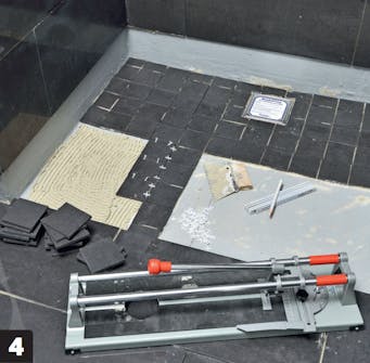 Runt om t.ex. hörn och rör ska plattorna skäras till med en vinkelslip med diamantklinga.