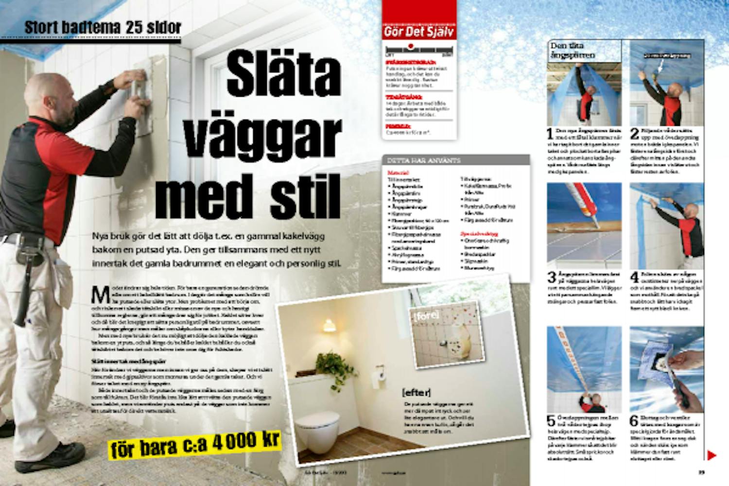 Kakelväggen finputsas med kakelfix. Vi drar ut det starka och smidiga fästbru-ket mycket tunt med en bred stålputsbräda, och vi är noga med att alla produkter kommer från samma tillverkare.