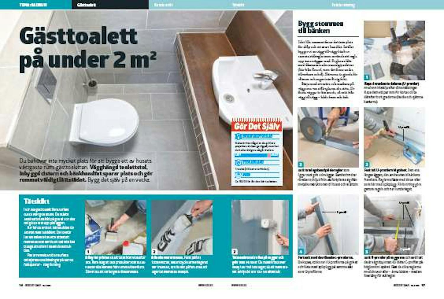 I det lilla rummet finns det inte plats för skåp och ett stort handfat. Istället bygger vi en vägg-till-vägg-bänk av samma stålreglar som används att regla upp innerväggar med. Reglarna kläs med fiberarmerade cementgipsskivor (här från Knauf, men det finns andra tillverkare också). Skivorna är gjorda för våtrum och suger inte åt sig fukt.