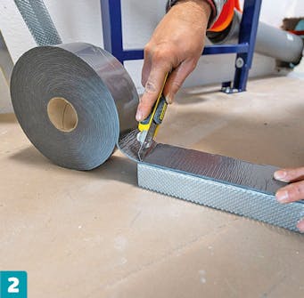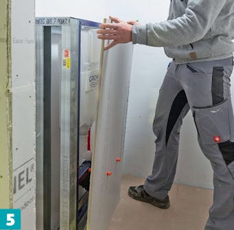 Sätt tätningsband på de reglar som ligger mot golv och väggar. Bandet hindrar rörelser och ljud från att fortplanta sig från metallkonstruktionen till huset och tvärtom.