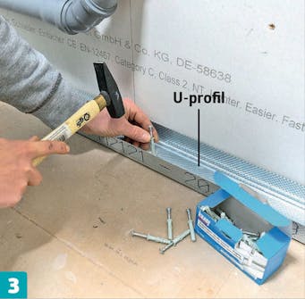 Fäst två U-profiler vid golvet. Den ena längs väggen, den andra ute vid bänkens framkant. Reglarna fästs med skruv eller som här med spikplugg. Förborrning görs genom regeln och ner i underlaget.