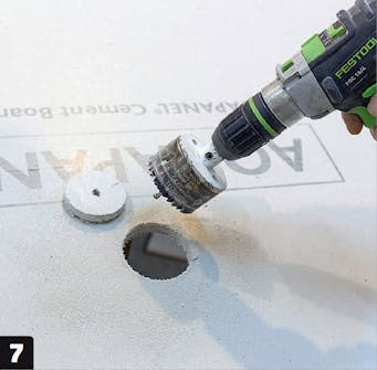 Markera hål för vatten och avlopp på plattan. Det görs mest exakt nerifrån genom hålen i fibercementskivorna.