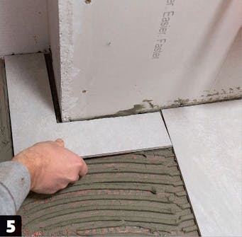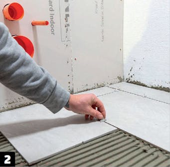 Lägger du dessutom plattorna i förband (med förskjutna fogar) som här, krävs det också lite extra tankemöda. Men tag dig den tiden, för det lönar sig när rummet är helt färdigt.