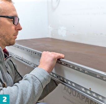 Börja med att mäta och markera på väggarna var stålreglarna ska sitta. De flesta väggar är lite sneda, så mät från vägg till vägg - både fram och bak.