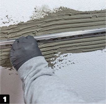 Börja med skyddsskenan som markerar övergången mellan kakel och putsad vägg. Markera på väggen var skenan ska sitta och fäst den med kakellim. Skrapa bort överflödigt lim från väggen.