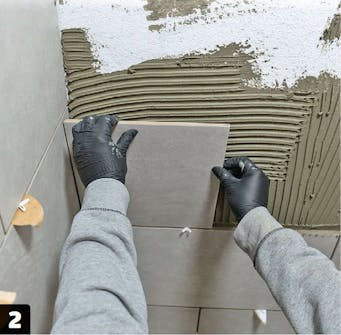 Sätt upp baksidan. Kapa plattan och sätt kakellim på baksidan innan den lyfts på plats och trycks fast ordentligt. Tryck eventuellt något mot plattan som håller den på plats medan limmet härdar.