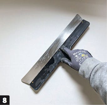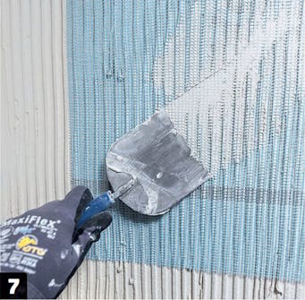 Spackelmassan armeras här med ett glasfibernät. På så sätt slipper du att spackelmassan spricker. Nätet trycks ner i spackelmassan och jämnas till med en vanlig spackel utan tänder.