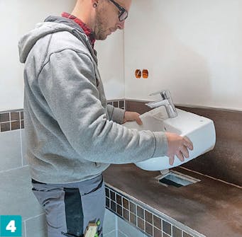 Handfatet lyfts på plats och trycks ner i silikonet. Dessförinnan ska du markera bänkens mitt och handfatets mitt, så att det kan sättas ner direkt på rätt plats.