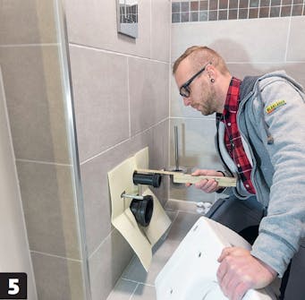 Anpassa alla rör på längden. Observera skyddet som sitter på väggen. Det ser till att toalettstolen inte trycker direkt på kaklet. Det skärs av allra sist, när toalettstolen är på plats.