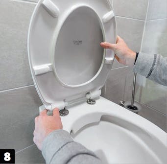 När allt klinker och kakel är på plats och fogat, och när handfatet sitter där det ska och är inkopplat, återstår bara att lyfta in toalettstolen och hänga den på plats.