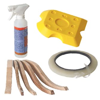 Det här behöver du: Glättningsvätska, fogbrickor/fogpinne, tejp i fogens bredd och en rulle maskeringstejp (inte med på bilden). Väljer du fogpinnar av trä ska de stå i tvålvatten ett dygn innan de används.