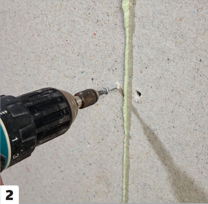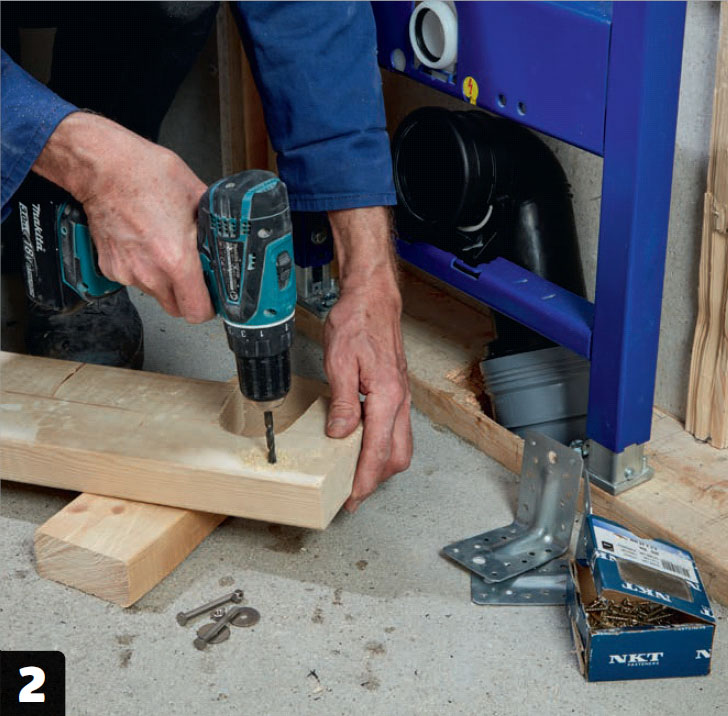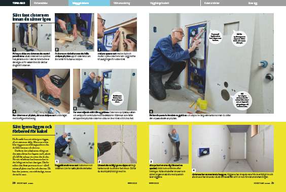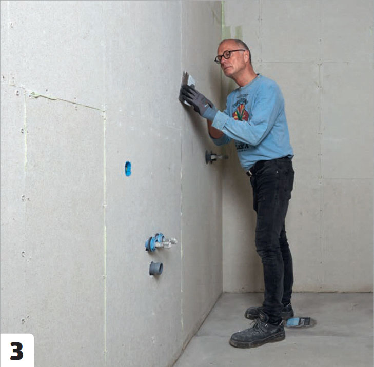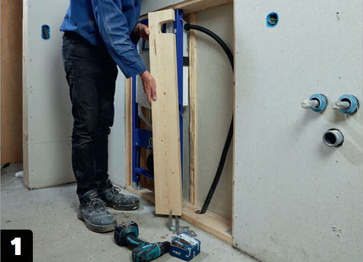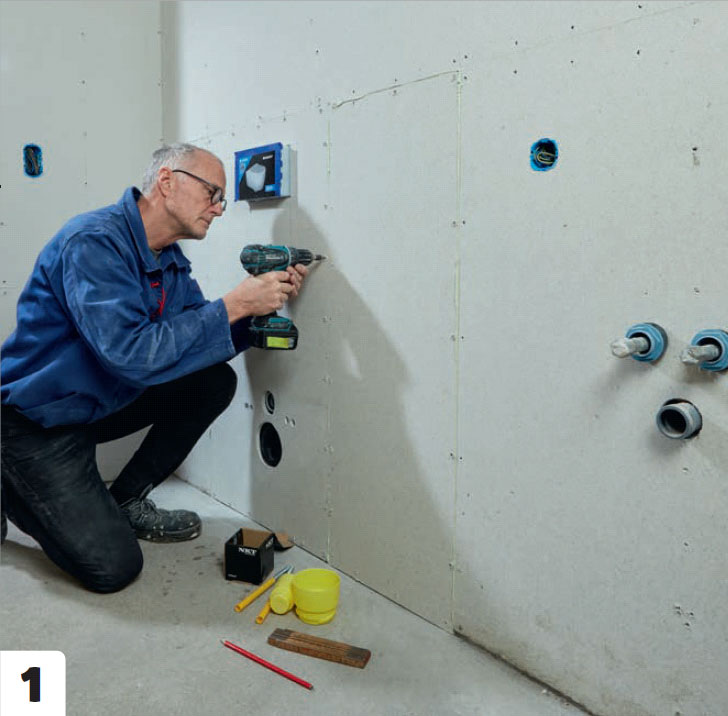 Nu återstår bara att sätta igen väggen, så att cisternen döljs. Eftersom vi här klär väggarna med fibergipsskivor ska de både limmas och skruvas.