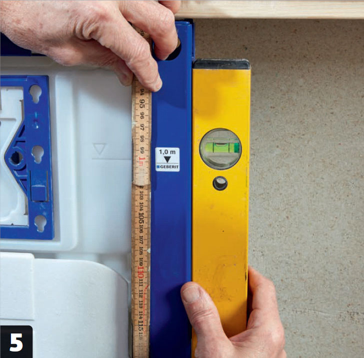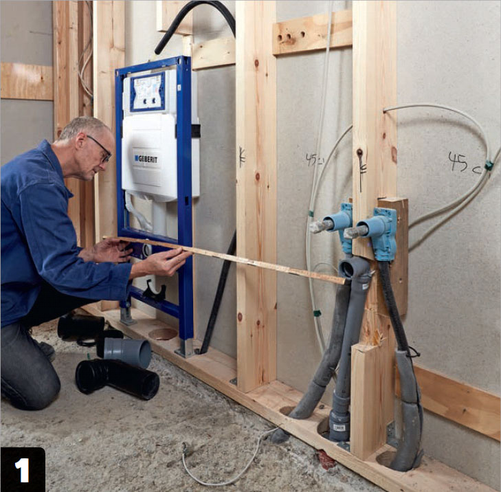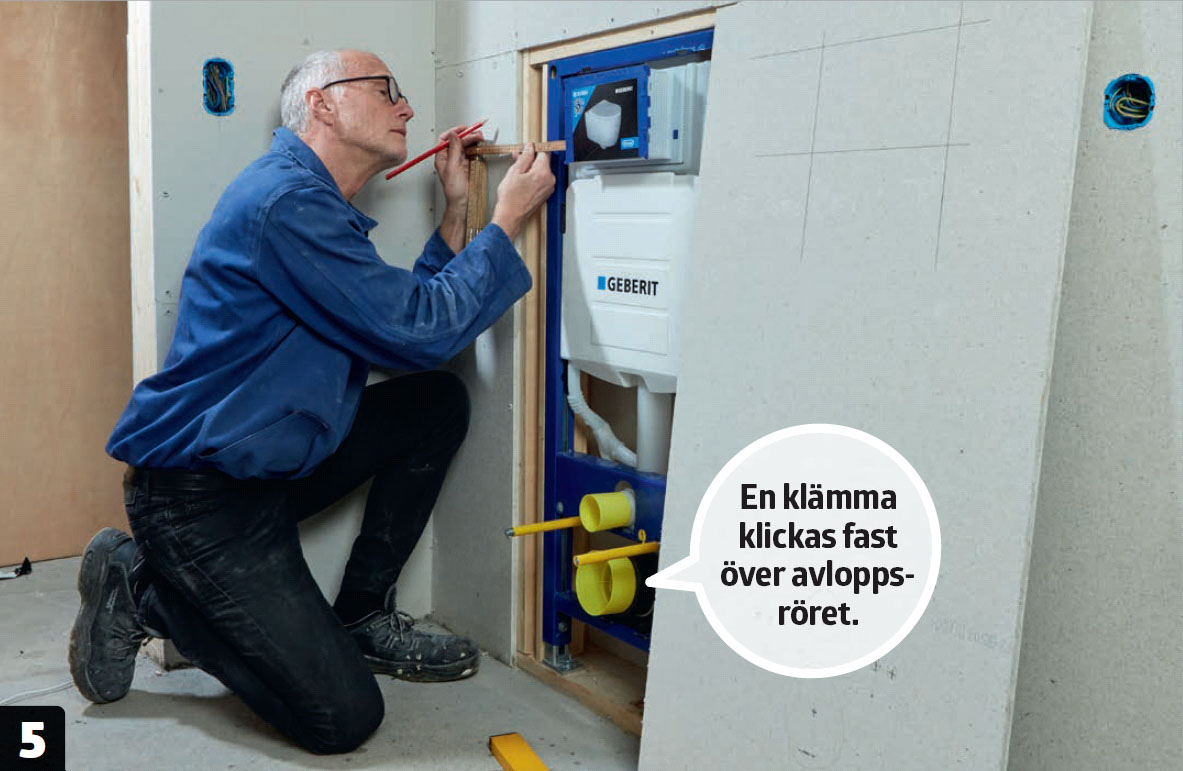 Gör en provmontering innan du sätter igen väggen. Här vill vi gärna ha större avstånd till handfatskommoden, så vi flyttar cisternen tio centimeter åt vänster.
