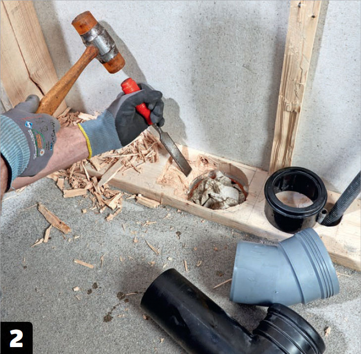 Hålet i syllen utvidgas med ett stämjärn för att göra plats för en böj. På så sätt kan cisternen flyttas lite.