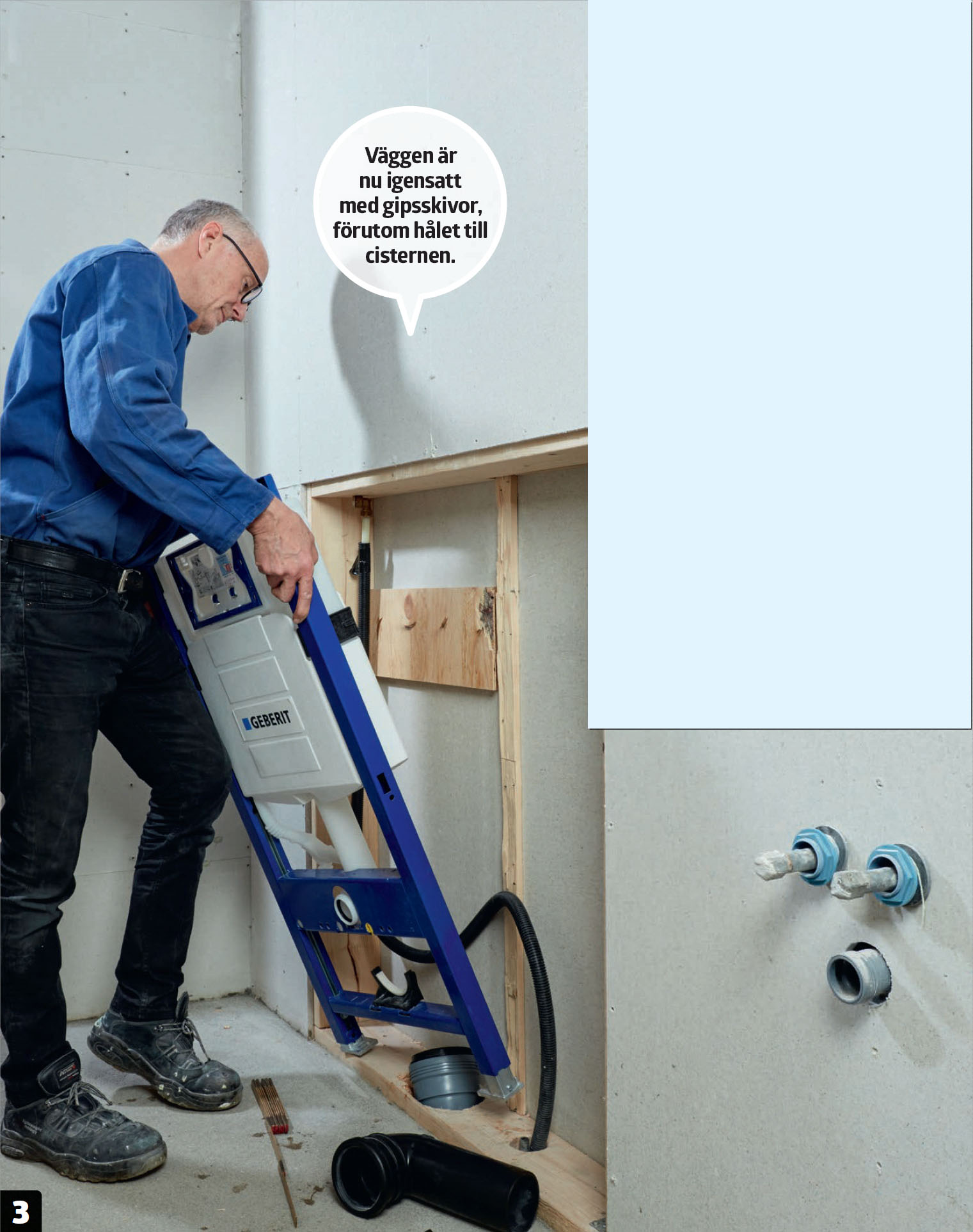 Cisternen sätts på plats när avloppet har anpassats och fibergipsskivor har satts på väggen runt det utrymme som cisternen ska placeras i.