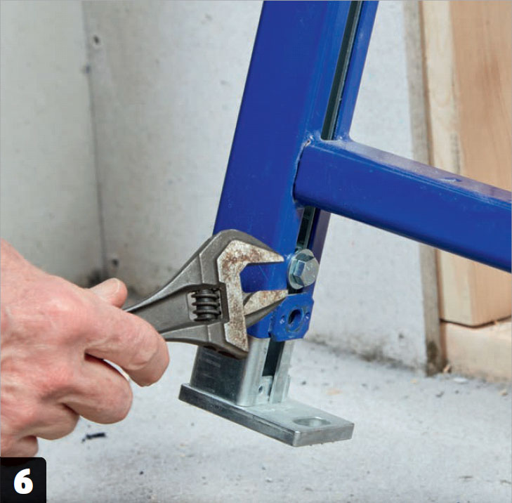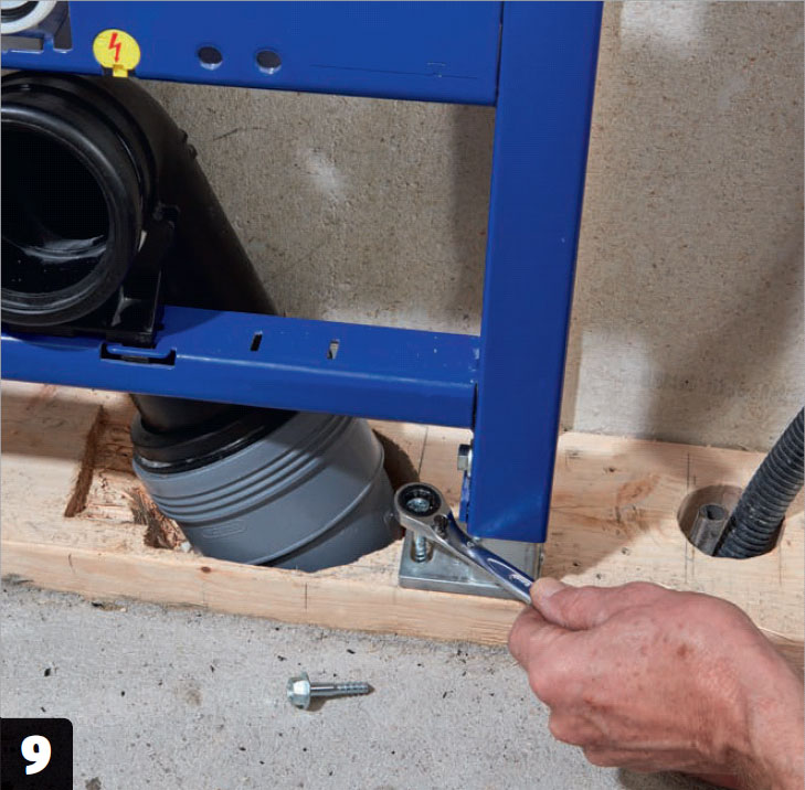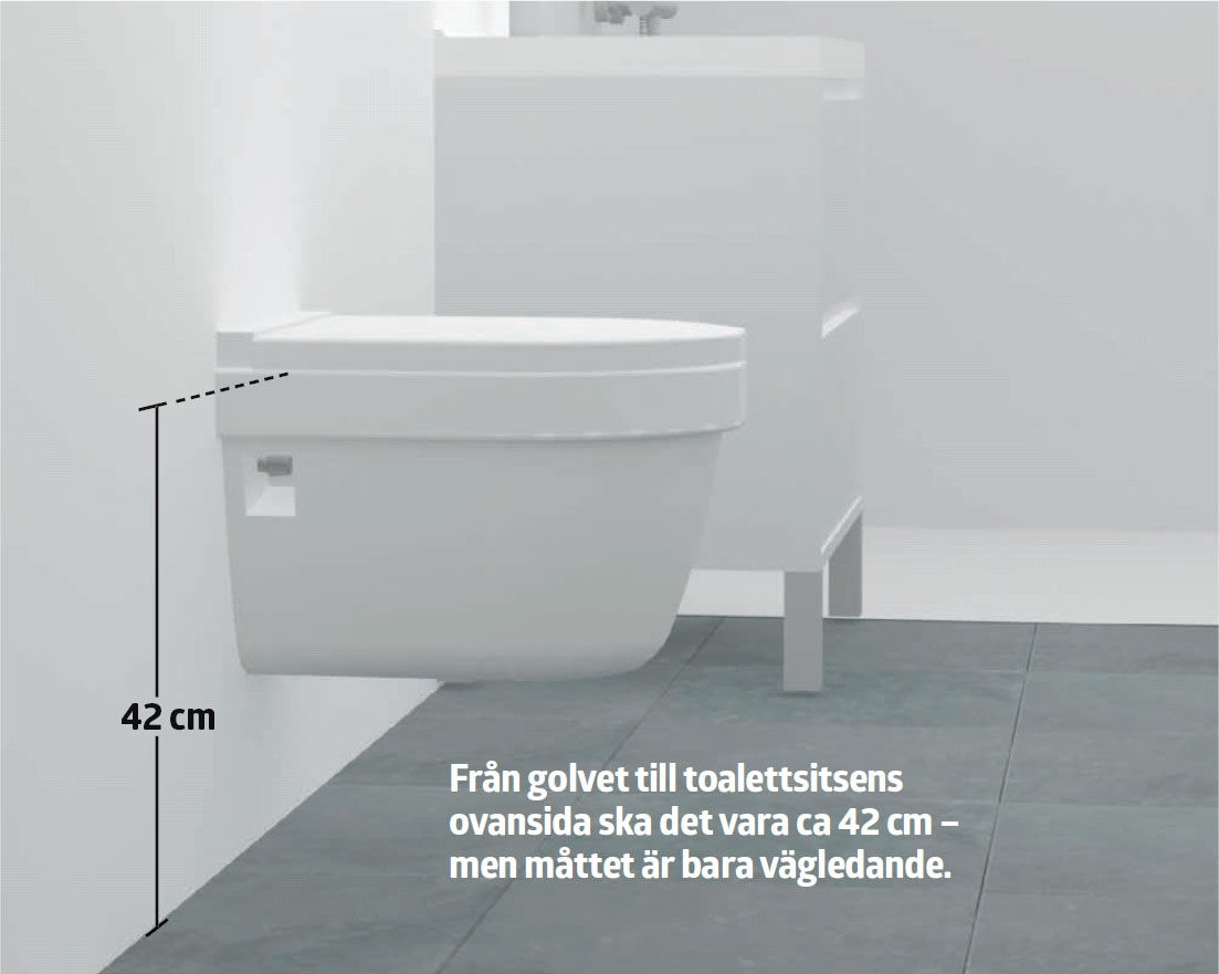 Toalettstolens slutliga höjd bestäms. Ska höjden vara högre än de normala ca 42 cm, justeras benen högre nu. Kom ihåg att ta hänsyn till höjden på den valda toalettsitsen. Spänn fast benen med en skiftnyckel.