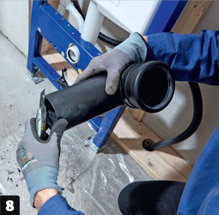 Ta bort spår från sågningen med en hobbykniv eller sandpapper. Gnid lite diskmedel på röret, så går det lätt att få på det på röret i golvet.