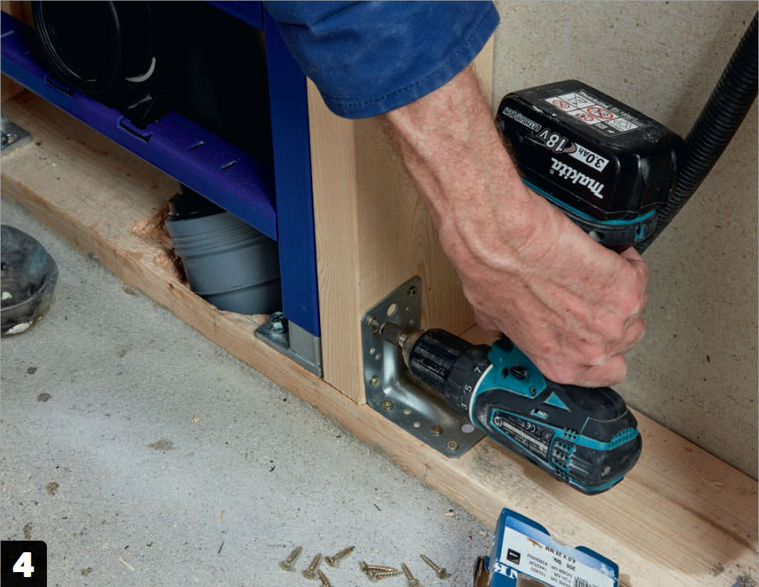 Förborra för de bultar som ska hålla stolpen på plats upp till cisternens ram. Borra hål för bultarna i stolpen.