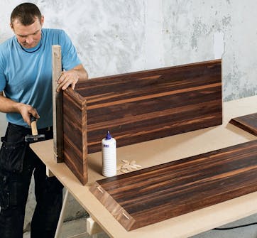 Nu kan lådan limmas ihop och man ska använda rikligt med trälim även om limmet är starkt. Sidorna spänns ihop med limknektar och reglar som skyddar ädelträet. Kolla noga att lådan blir vinkelrät!