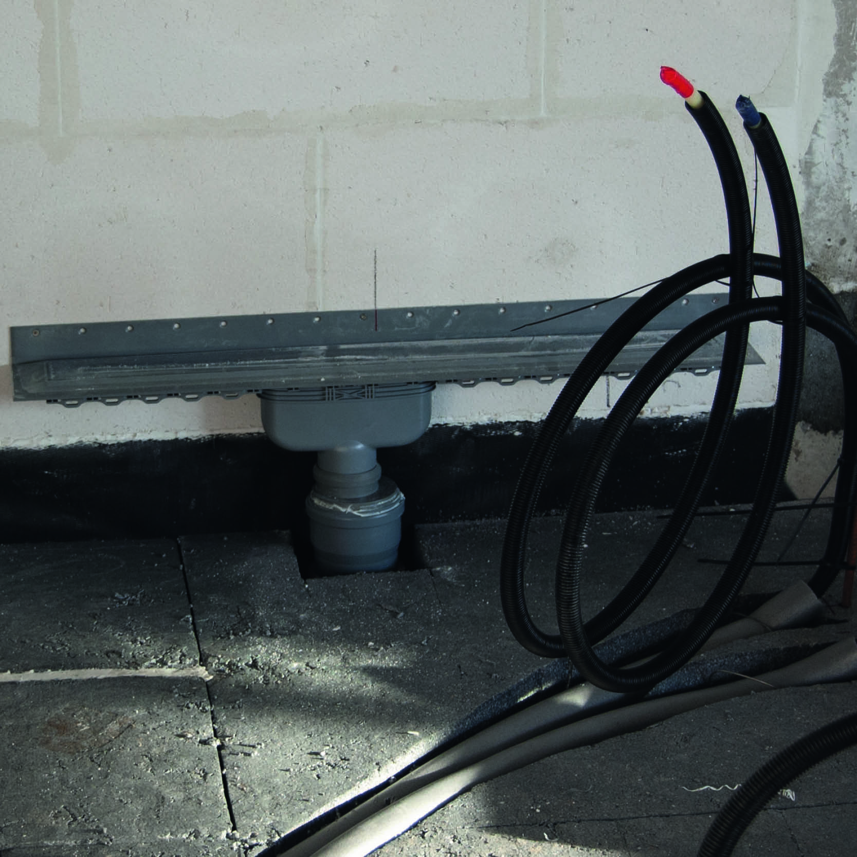 - 4: En avloppsränna med ett fabriksmonterat utloppshus som gjuts fast i golvet.