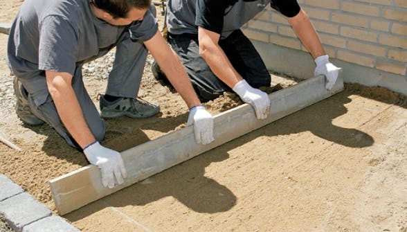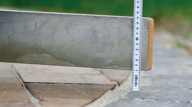 Det är lättast att skapa en alldeles plan yta på grusbädden om du först har grävt ner två långa och absolut raka järnrör. Därefter dras gruset av med en rätskiva eller rak bräda, som förs i sicksack på rören.