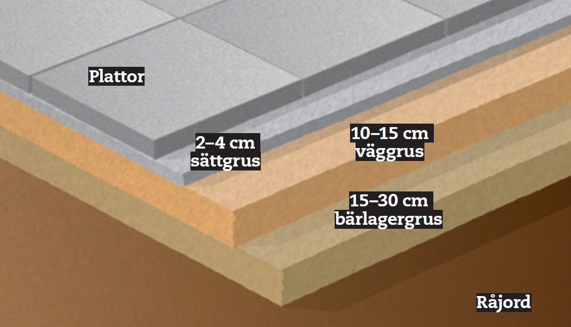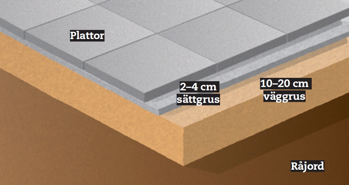 När du lägger gångplattor eller stenar bestämmer din läggning åt vilket håll regn- och smältvatten ska rinna. Fallet bort från huset ska vara minst 2 cm per meter. Gångar och infart bör ha ett fall på 1 cm/meter.