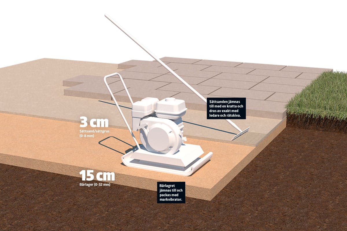 Till uppfarter och terrasser måste du hyra en markvibrator. Satsar du på en modell som väger minst 100 kilo, kan den väldigt effektivt packa bärlagret så att det just blir ett lager som bär. När du till sist sopar ner fogsand mellan plattorna kör du över plattorna med markvibratorn i omgångar så att fog- sanden packas och täpper igen fogarna.