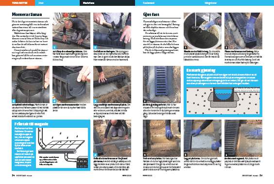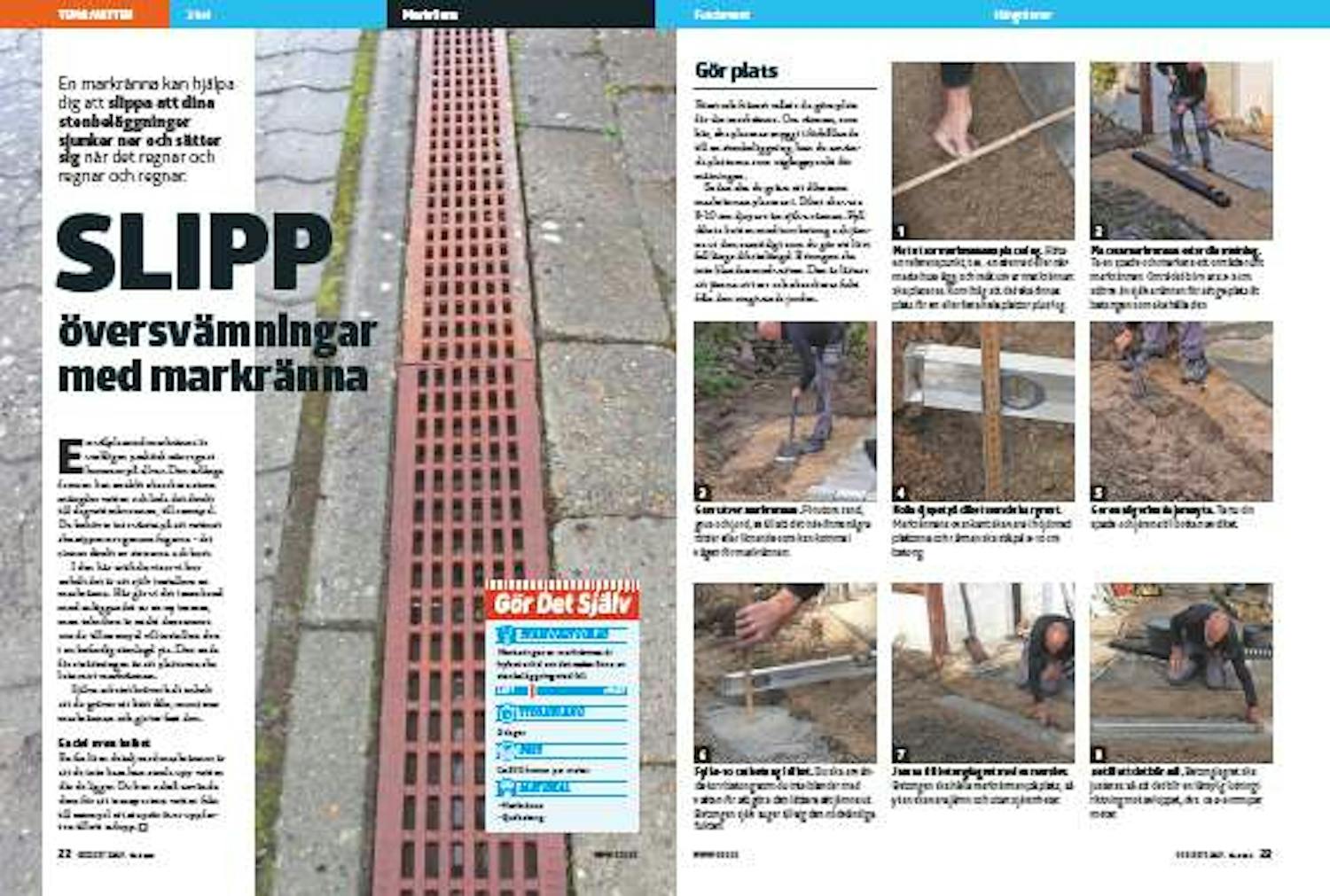 Nu är det dags att montera rännan och göra ett avrinningshål i ena änden så att vattnet kan rinna till tex en stenkista eller dagvattensystemet. Markrännor kan köpas i olika längder.