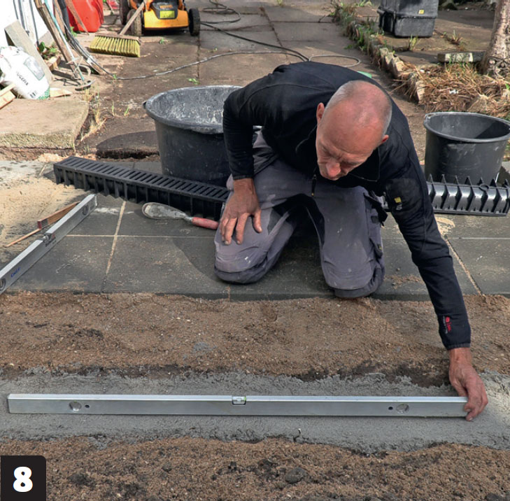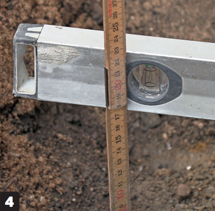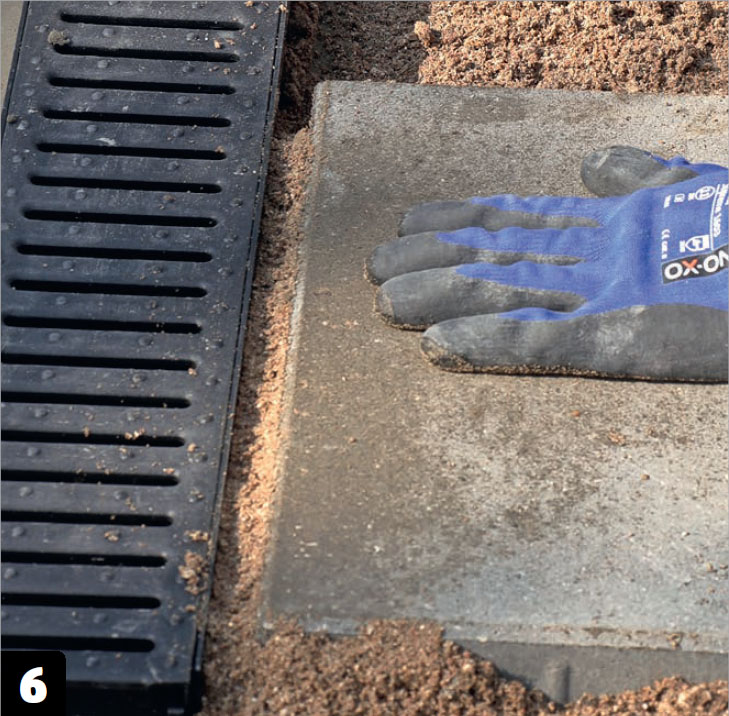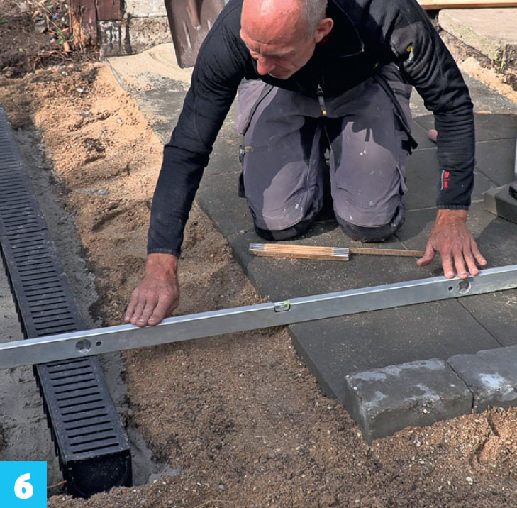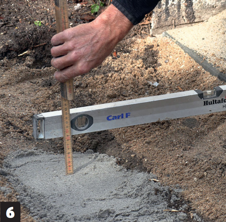 Kolla djupet på diket som du har grävt. Markrännans ovankant ska vara i höjd med plattorna och rännan ska stå på 8-10 cm betong.