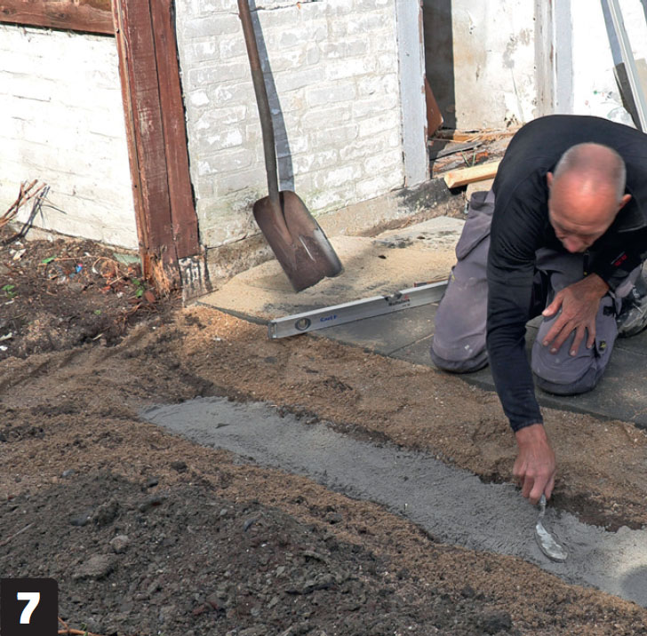 Förbered för plattor. När betongen har härdat och du har lagt på ett lager sand ska den jämnas till. Det gör du enkelt med en skrapa som du kan göra av en list fastspänd på en bräda som är lika hög som plattorna.