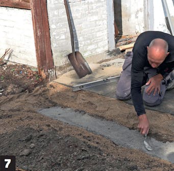 Jämna till betonglagret med en murslev. Betongen ska hålla markrännan på plats, så ytan ska vara jämn och utan ojämnheter.