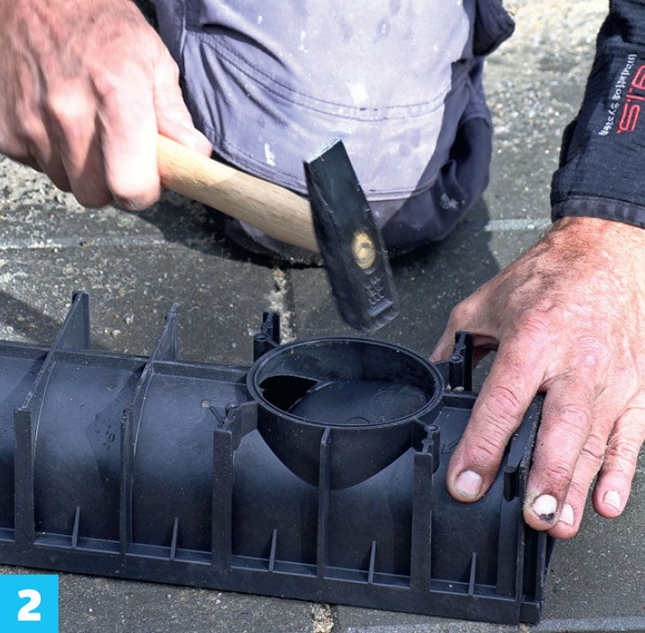 Gör hål för avrinningen. Slå ut pluggen i ena änden av den nymonterade markrännan. Den är gjord så att den lätt kan skiljas från resten av rännan med en hammare.