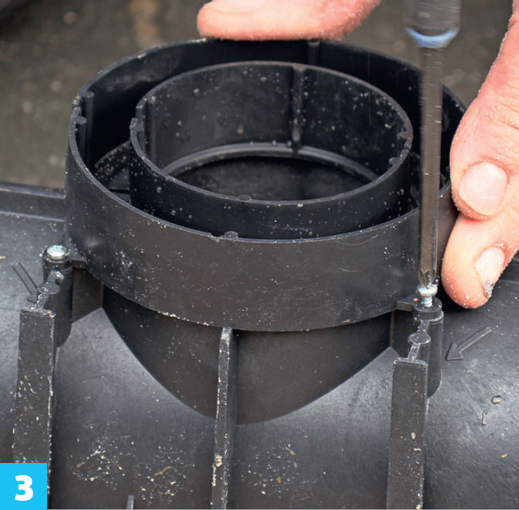 Sätt på ett lodrätt utlopp. Markrännan är utrustad med hål som passar till ett lodrätt utlopp som skruvas fast. Utloppet gör att du kan ansluta ytterligare rör eller helt enkelt leda bort vattnet tex i jorden.