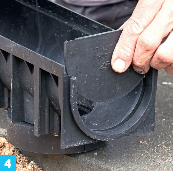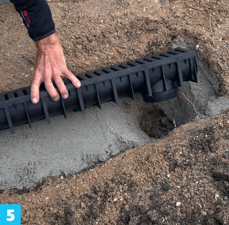 Lägg försiktigt markrännan på plats. Om den ska anslutas till ett dagvattenmagasin eller en brunn, som här, ska det lodräta avloppet placeras direkt över ett hål i betonglagret.