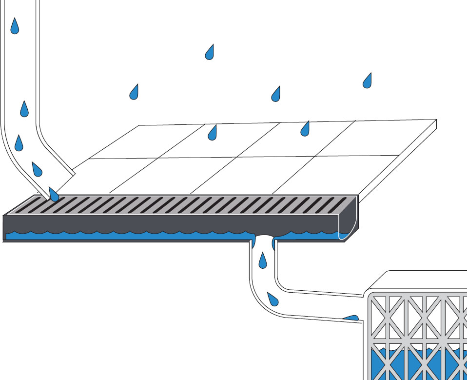 Här använder vi två 1 meter långa element som är lätta att klicka ihop och sedan behöver du bara ta bort en barriär mellan de två delarna för att vattnet ska rinna fritt.