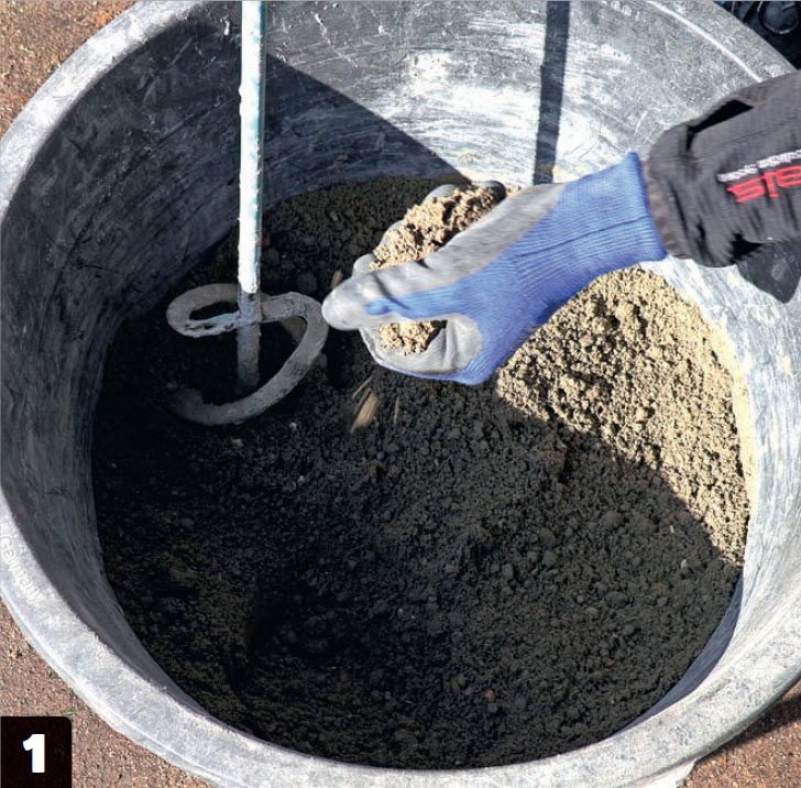 Blanda en stor hink betong. Du ska snåla med vattnet så att betongen liknar fuktig jord eller sandlådesand. Den får inte bli så våt att den rinner.