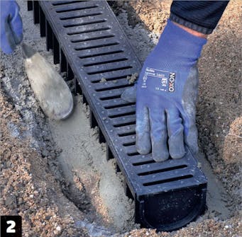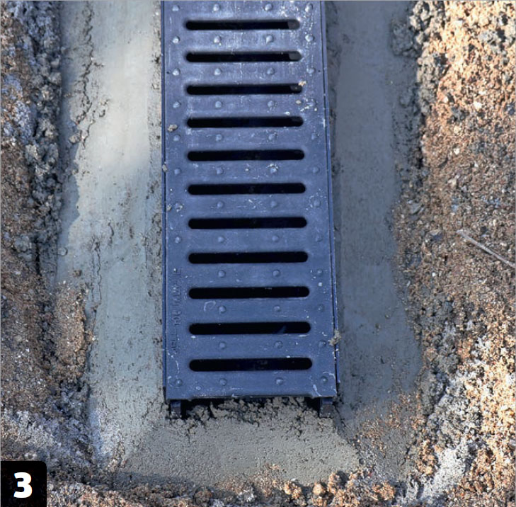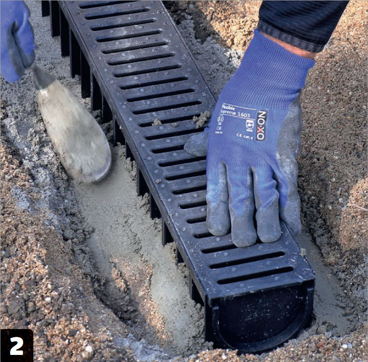 Sedan ska du gräva ett dike som markrännan placeras i. Diket ska vara 8-10 cm djupare än själva rännan. Fyll dikets botten med torr betong och jämna ut den samtidigt som du gör ett litet fall längs dikets längd. Betongen ska inte blandas med vatten. Den är lättare att jämna ut torr och absorberar fukt från den omgivande jorden.