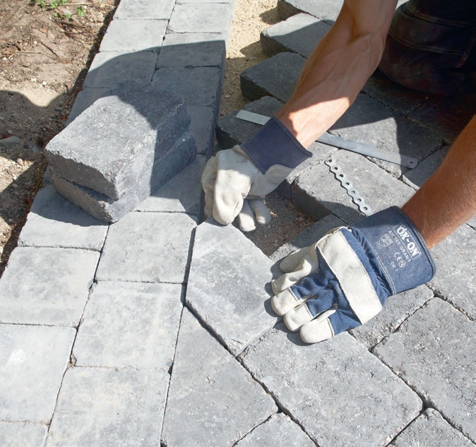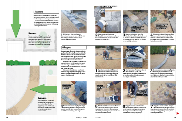 Börja i ett hörn och lägg stenarna innanför ramen. Du bestämmer själv vilket mönster du vill använda i läggningen. Ju mer komplicerat mönstret blir, desto flera stenar går det åt.