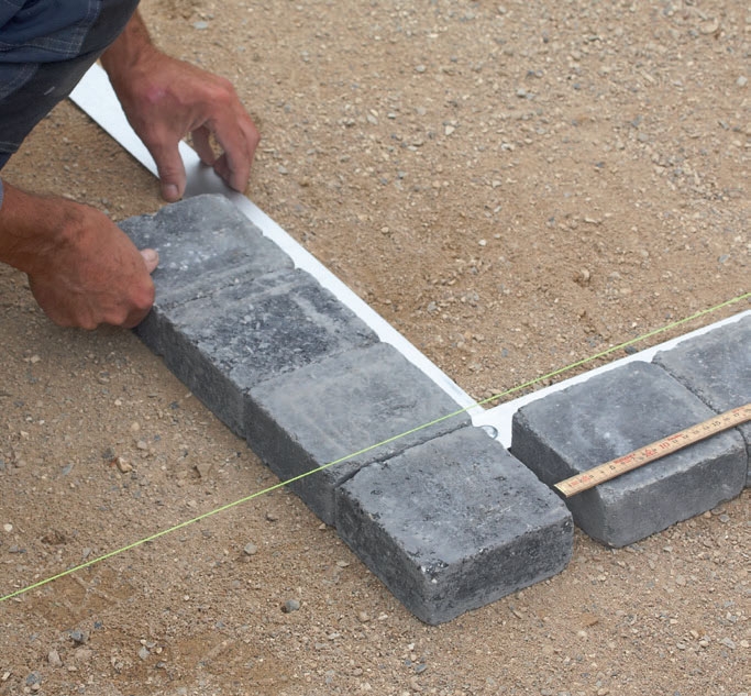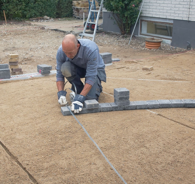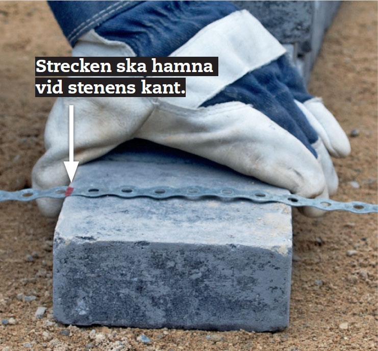 Följ snöret. Dra ett snöre som markerar kanten på ramen. Då blir det lätt att lägga stenarna rakt. Här läggs dubbla kvadratiska stenar.