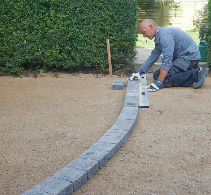 Den sista stenen justeras på plats. Eftersom gången ska avslutas vid öppningen i häcken kan ramen justeras med hjälp av en rätskiva. Det går också bra att använda en lång rak bräda.