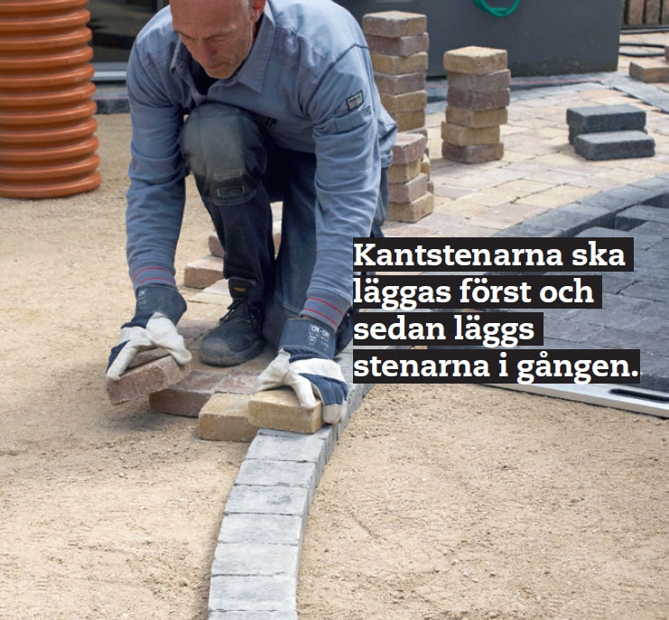 Lägg flera rader i sänder. Det viktigaste när du anlägger en gång är att du hela tiden ska ligga ett par stenar före längs kanterna. Det är nämligen kantstenarna som styr läggningen.