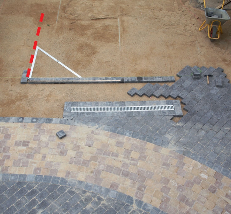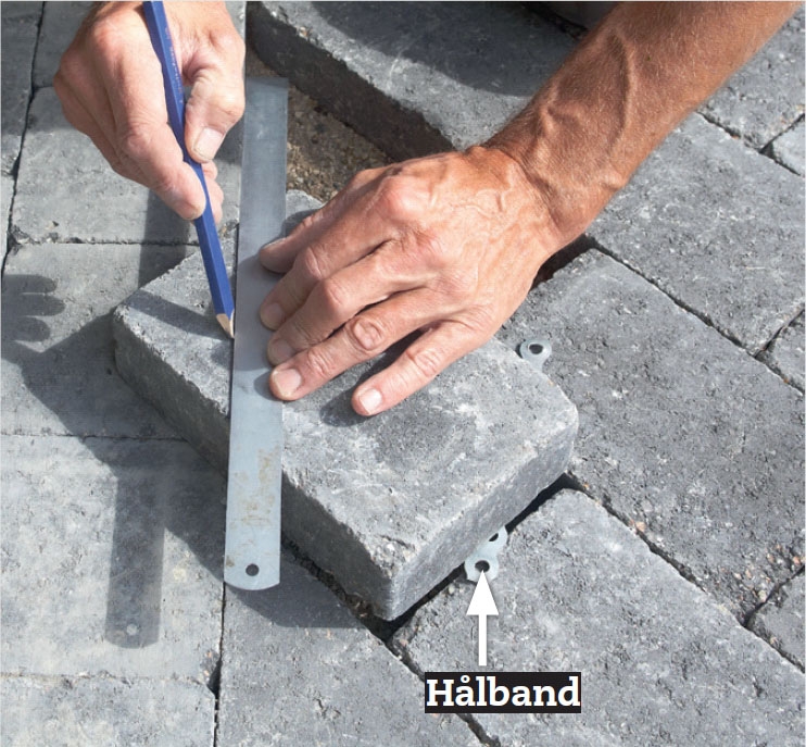När kantstenarna är på plats läggs stenarna i gången. De ska förskjutas en halv sten från dem i ramen. Återigen är det hålbandet som styr placeringen.