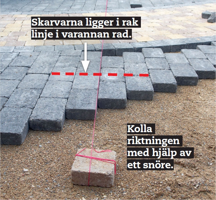 Var noga med riktningen. Spänn ett snöre så att du har något att kolla riktningen med. Fogarna ska ligga på rak linje på båda sidorna av gången, och det kollas med ett långt snöre.