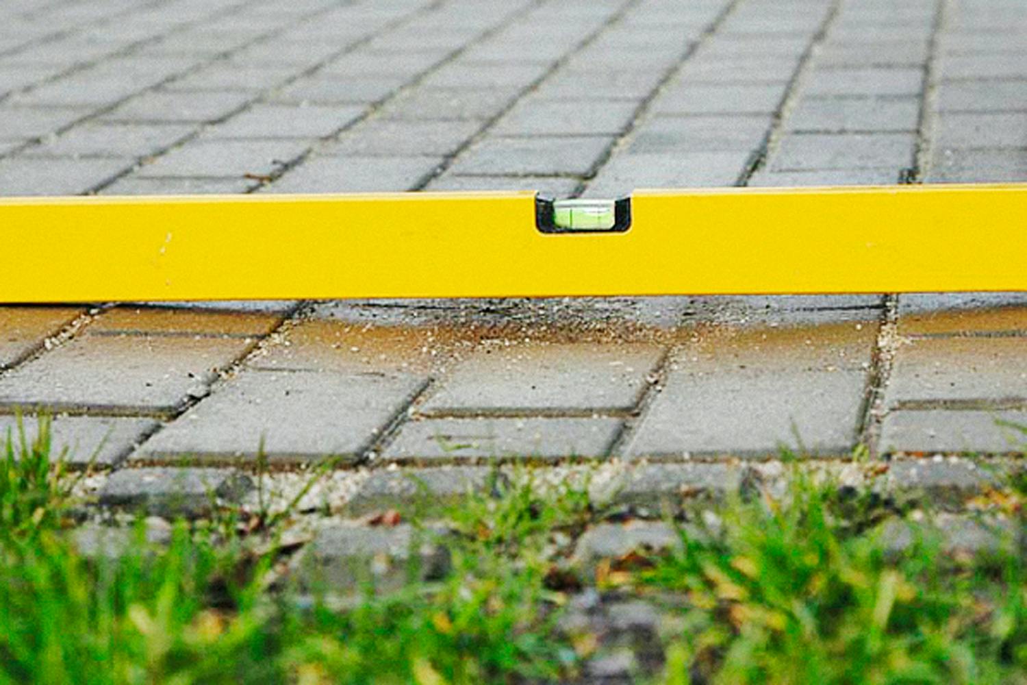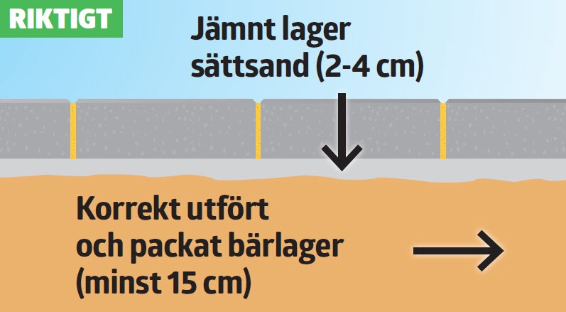 3. Fyll hålet med sättsand, och jämna till med en hjälpbräda (se nedan). Brädan ser till att sanden går 15-20 mm upp mot existerande beläggning. På så sätt blir höjden bra när beläggningen packats.