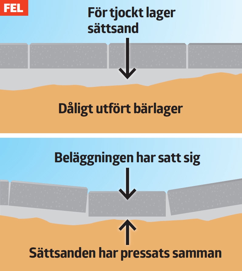 2. När tillräckligt många stenar tagits upp, avlägsnas sättsanden helt ner till bärlagret. Det är lätt att se skillnad, då bärlagret innehåller sten. Om bärlagret satt sig, rättas det också till och packas.
