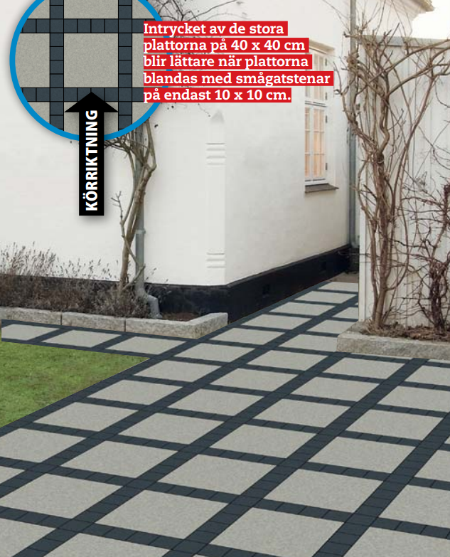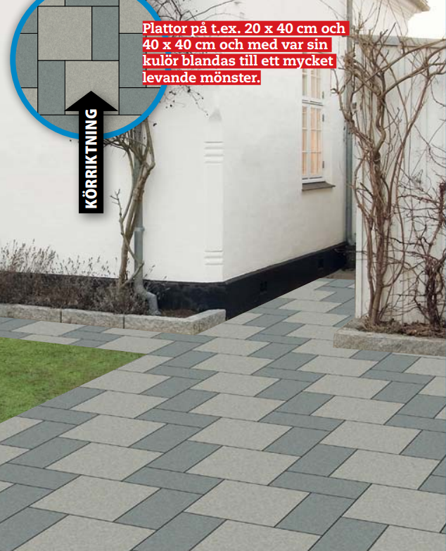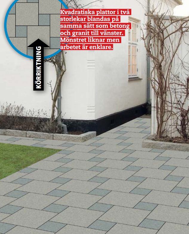 Betongplattor och granit blandas i ett modernt mönster. Arbetet blir lite svårare längs sidorna, där du antingen ska kapa flera plattor eller fylla på med flera smågatstenar.
